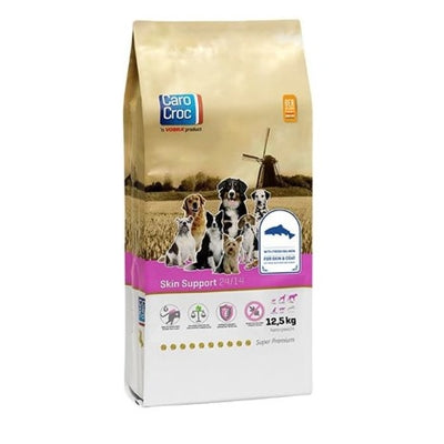 De Carocroc Skin Support 12,5 kg is een volledige hondenvoeding die bereid is met verse zalm en die ondersteuning biedt voor een gezonde huid en glanzende vacht. Een mooie huid en vacht gaan gepaard met goed voer. Daarom is Skin Support van Carocroc speciaal ontwikkeld om extra aandacht te geven bij een gevoelige huid of een verslechterde huid- en vachtconditie. De brokken bevatten verse zalm en zalmolie welke een glanzende vacht en een gezonde huid ondersteunen. Ook bevat het essentiële omega-3 en 6 vetzuren, welke bijdragen aan de gezondheid maar niet door het lichaam zelf kunnen worden aangemaakt. Deze voeding is vrij van tarwegluten.