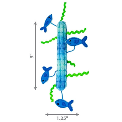 De Kong Kickeroo Stickeroo Met Kreukgeluid En Catnip Blauw 26X11X2 cm is een kattenspeeltje met catnip en krinkelgeluid in lange vorm. De Kickeroo Stickeroo van Kong is hét droomspeeltje voor iedere kat. Het kreukgeluid trekt de aandacht van de kat en de lange vorm nodigt de kat uit met het volledige lijf met het speeltje te worstelen. De visjes en het zeewier steken uit en wekken de vanginstincten op. Het catnip in het speeltje geeft het speelplezier nog een extra boost!