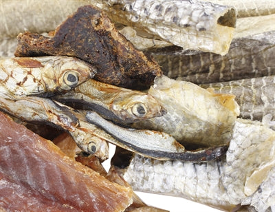 samenstelling: sprot, zalmhuidbites, kabeljauwhuid, witvisfilet en gevormde snacks.