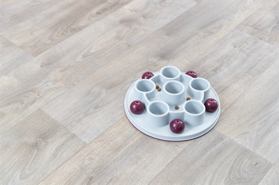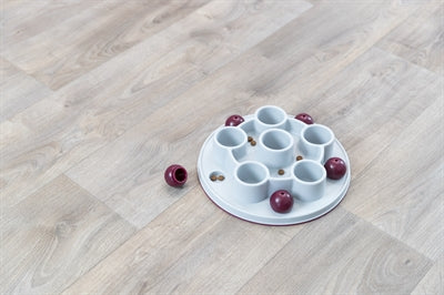 De Trixie Cat Activity Pentagon Wit/Bordeaux 28 cm is een speelbord voor de kat dat de kat uitdaagt zijn voer of snacks uit de kuiltjes te vissen. Perfect om verveling tegen de te gaan en de kat mentaal te stimuleren! Dit speelbord bestaat uit vijf kuiltjes en vijf afdekkogels, waaruit en waaronder vandaan de kat met zijn poot zijn beloning moet zien te vissen. Dit daagt de kat uit actief bezig te zijn met zijn voer, zorgt voor mentale stimulatie en gaat verveling tegen. Dit speelbord wordt geleverd met een handleiding voor training en is voorzien van een rubberen onderkant die zorgt dat het bord niet verschuift tijdens het spelen.