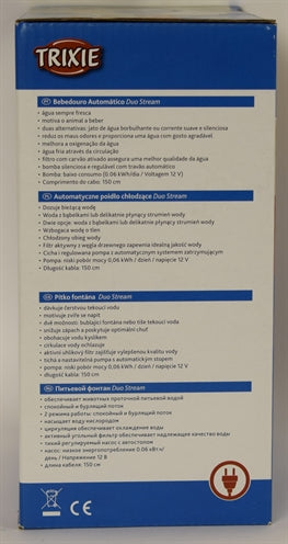 Water drinken wordt veel aantrekkelijker met deze drinkfontein voor de hond of kat van Trixie! Deze drinkfontein, met een inhoud van 1 liter, geeft vers, stromend water. Dit stimuleert dieren om vaker water te drinken, daar het geen geuren absorbeert en een betere smaak geeft. Door de watercirculatie vindt er natuurlijke koeling plaats en wordt er voor zuurstofrijk water gezorgd, vooral in combinatie met het actieve koolfilter, dat voor betere waterkwaliteit zorgt. De verstelbare pomp met auto-stop biedt je twee opties: bruisend water of een zachte waterstraal. Zo heb je dus altijd vers water voor je dier, zonder dat het teveel energie kost!