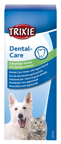 De Trixie Gebitsverzorgend Mondwater Hond / Kat 300 ml met appelaroma verzorgt het gebit van hond of kat via het drinkwater, voor een betere hygiëne in de bek. De gemakkelijkste gebitsverzorging voor jouw hond of kat: simpelweg schudden en het mondwater in een verhouding van 1:50 aan het drinkwater toevoegen. Het mondwater lost op in het water en helpt om schadelijke bacteriën in de mond te voorkomen. Zo zorg je voor een betere hygiëne in de bek van het dier een daardoor een frisse adem en gezonder gebit.